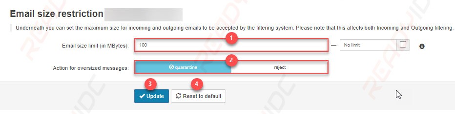 2.2. หากกำหนดลิมิตไว้ ให้เลือกที่ Action for oversized messages คลิกเลือกที่ quarantine หรือ reject